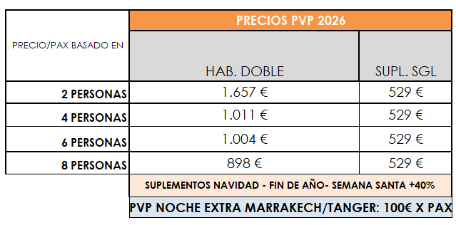 Desayuno en el alojamiento. A la hora indicada, traslado privado al aeropuerto de Marrakech para tomar el vuelo de regreso