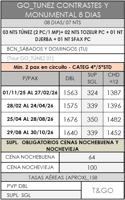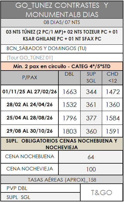 Importante: Según el número de participantes, el recorrido:del día 4 tarde, tras el almuerzo en Matmata a Ksar Ghilane para la noche en jaimas. Este trayecto será realizado por un chofer-guía en lengua hispana. del día 5 mañana, desde Ksar Ghilane a Gabes antes del almuerzo. Este trayecto será realizado por un chofer-guía en lengua hispana.Siendo el resto del viaje acompañado por un guía nacional profesional y homologado por la ONTT en lengua hispana.