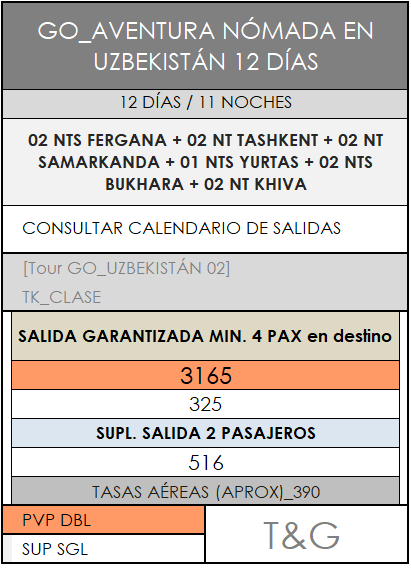 Llegada al aeropuerto de Tashkent. Traslado y alojamiento en el hotel. Desayun en el hotel. Visitaremos la parte antigua de la ciudad, Khasti Imom, incluso Madrasa Barak Kan, Madrasa Kafal Shohi, Biblioteca, situada en la misma plaza y tiene su importancia por albergar el “Corán de Usman”, original del siglo VII. También nos acercaremos hasta el mercado oriental de Chorsu,el Museo de Artes Aplicadas, metro. Almuerzo en restaurante local. Tour Panoramico en Tashkent: la Plaza de Independencia y Eternidad,esta plaza se compone el Monumento de la Independencia y el Humanitarismo inaugurado en 1991, Plaza de Opera y Ballet, Plaza de Amir Temur. Descanso en el hotel.