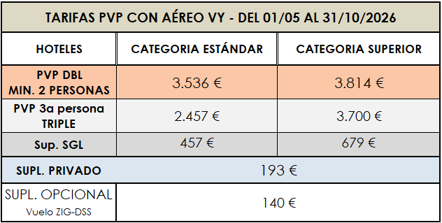 1NT DAKAR + 1NT LAGO ROSA + 1NT ST LOUIS + 1NT LOMPOUL + 2NTS SALOUM + 1 NT TAMBACOUNDA + 2NTS KEDOUGOU + 1NT KOLDA + 2NTS CAP SKIRRING + 1NT KIGUINCHOR + 1NT SALY/SOMONE