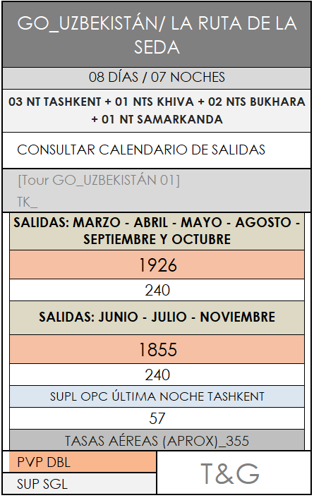 espués de desayunar en el hotel de Khiva, nos adentramos en el fascinante complejo arquitectónico de Ichan-Kala, declarado Patrimonio de la Humanidad por la UNESCO, donde admiramos el majestuoso Minarete Kalta Minor, la Madrasa Mohamed Amin Khan —hoy convertida en hotel—, el histórico Castillo Kunya Ark y la elegante Madrasa Mohammed Rakhim Khan; tras esta primera inmersión cultural, disfrutamos de un almuerzo en un restaurante local acompañado de una bebida a elección, para luego continuar con la visita al estilizado Minarete y la Madrasa Islom Khodja, la solemne Mezquita Juma con sus columnas de madera, el palaciego complejo Tash Hovli con su antiguo harén, el Mausoleo de Pahlavan Mahmud, venerado como patrón de la ciudad, y la Madrasa junto al Caravanserai de Allakuli Khan que evocan la vida comercial de la época; al finalizar la jornada, nos trasladamos al aeropuerto de Urgench, situado a unos 30 kilómetros, para tomar el vuelo hacia Tashkent según disponibilidad y horarios, donde al llegar nos alojamos en el hotel y concluimos el día con un merecido descanso.
